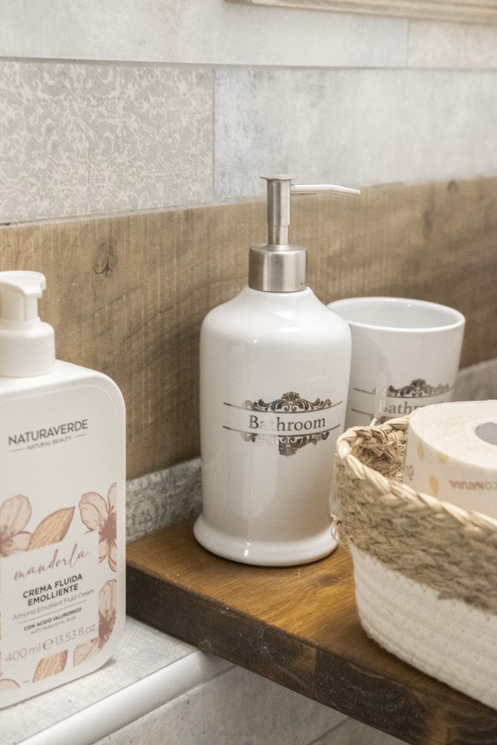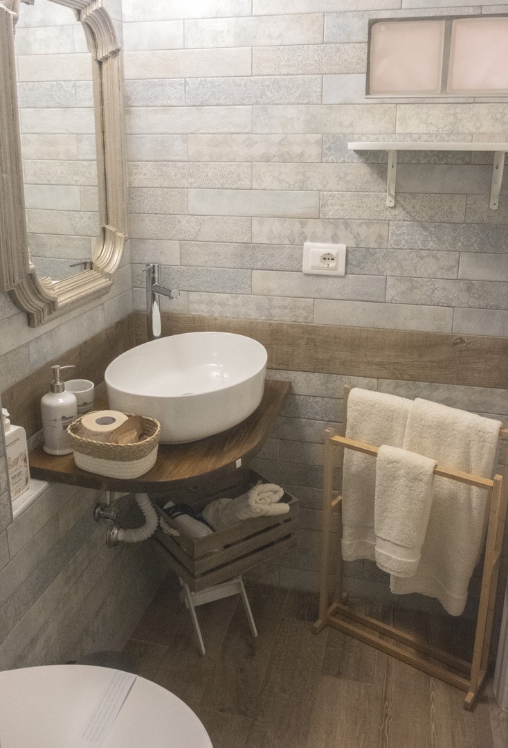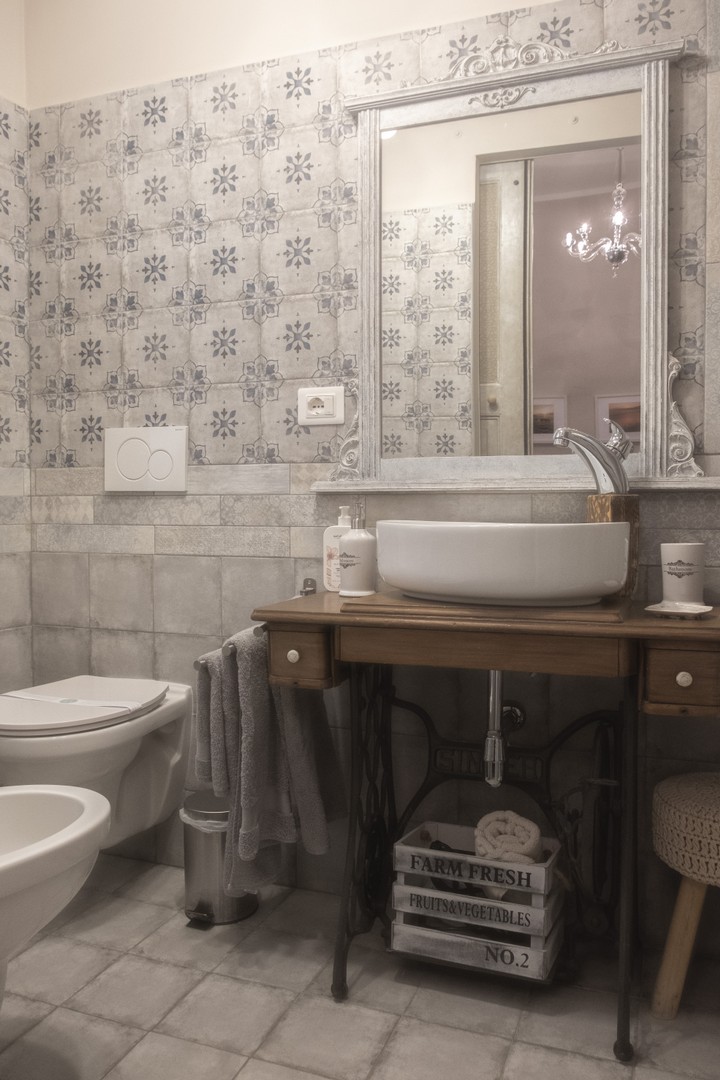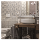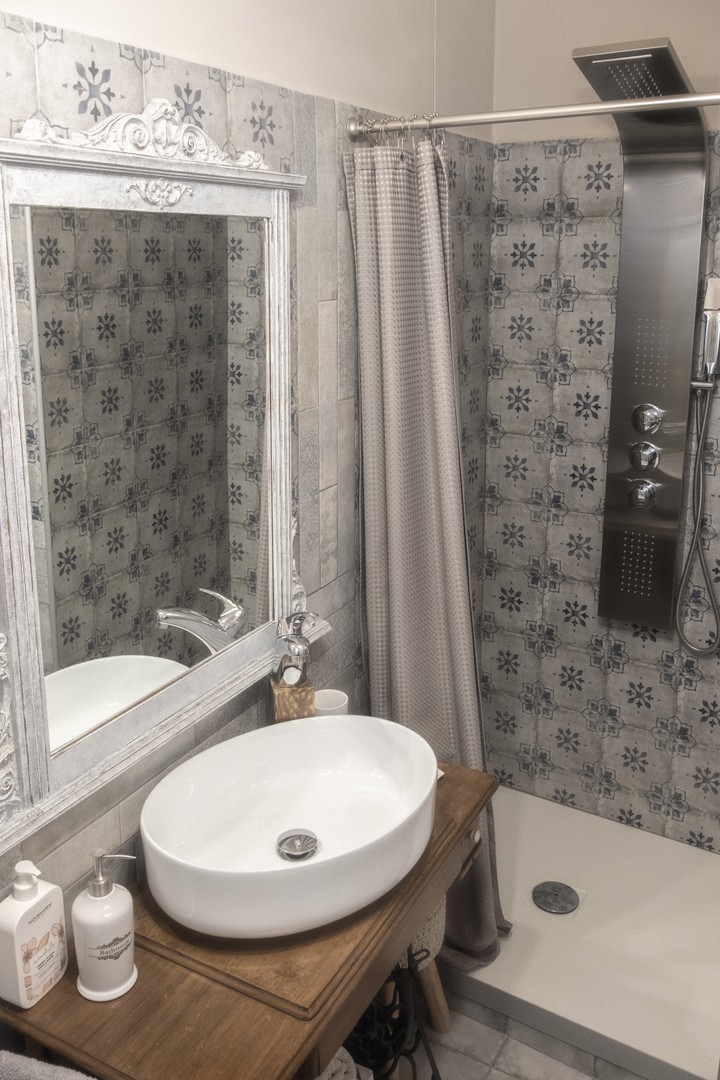 Il bagno ha una doccia con idromassaggio lavandino, bidet e wc sospesi.